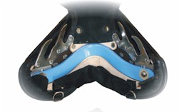 Because the Flexi-Head™ has the ability to distort around whatever headplate shape we put in it we have made two type of headplate shape to suit the different needs of horses. Our headplate types are “V” and “U” type, which denotes the shape or radius of the arch of the headplate. Shown in (c.)